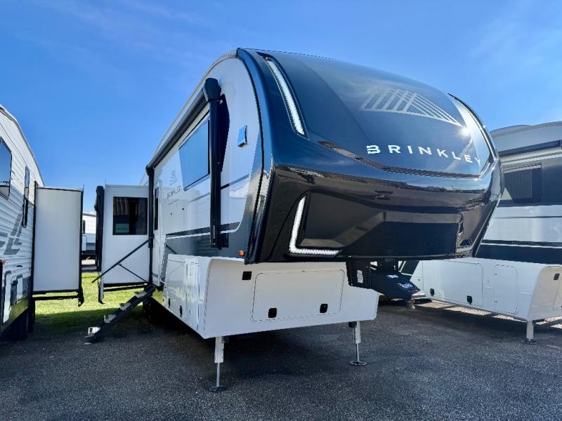 The Brinkley mid-profile Model Z fifth wheels bring you clean lines and an upscale look with plenty of style and exciting new features like the industry first brass plumbing connections. These units also feature an automotive grade front cap, plenty of exterior storage, dual exterior hot and cold showers, and wide stance leveling jacks for easy set up. Residential frameless windows provide a clean look and beautiful views, and ample electrical outlets and 6 USB/USB-C outlets allow all of your electronics and appliances to easily be used and charged.