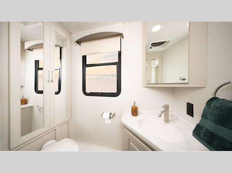 Each unit is held together with a Freightliner S2RV chassis, a one-piece, crowned fiberglass roof, and TuffShell vacuum-bond laminated sidewalls, plus they are powered by a Cummins ISB 6.7L engine. The exteriors are full of conveniences like a shower, utility center, an entertainment center, and a carpeted, full pass-through storage compartment with lockable slam latch doors to keep your outdoor gear! The interior will feel just like home with raised panel hardwood cabinetry and porcelain tile flooring, and the Firefly Multiplex system will let you control all your coach's function with ease.