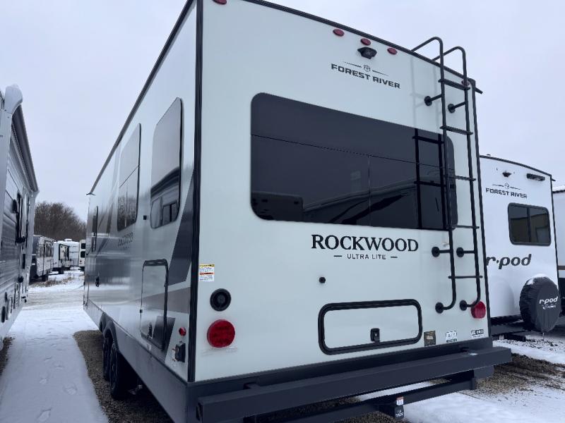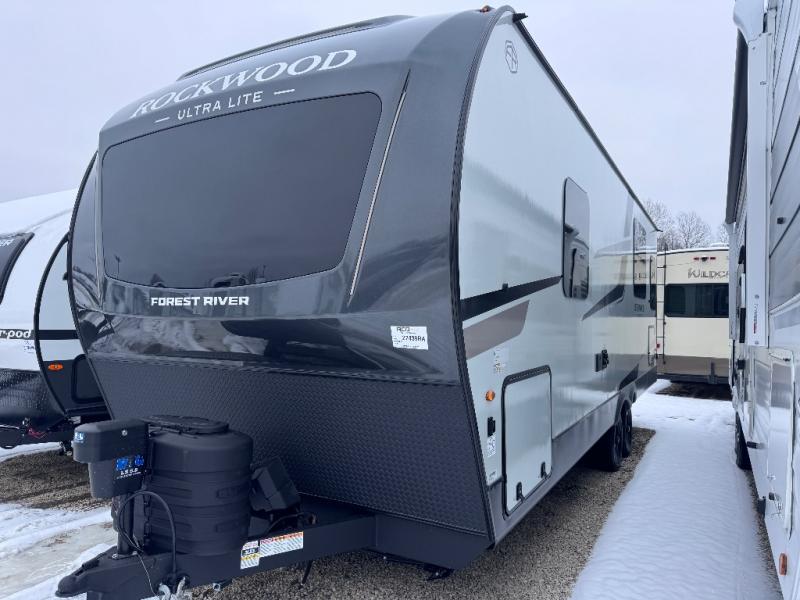 Each Rockwood Ultra Lite travel trailer by Forest River includes superior construction with a high gloss fiberglass cap, aluminum cage construction, and a power awning with LED lighting for a cozy and functional outdoor space. The torsion axle, power tongue jack will make towing smooth and hassle-free, along with the nitrogen filled, Goodyear Endurance tires and the tire pressure monitor system. Interior comforts include kitchen sink with high rise faucet, hidden hinge cabinet doors, and roller shades to name a few. Choose a Rockwood Ultra Lite travel trailer today!