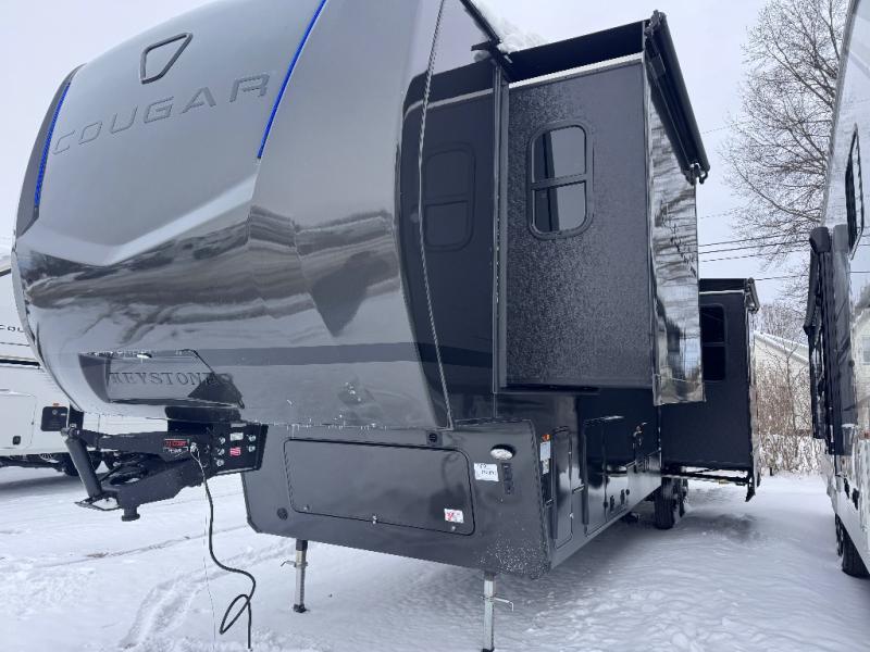 Spend more time having fun and less time worrying about your RV with the Keystone Cougar fifth wheel! These units have all that you will need for excellent vacations. The interior comes hardwood cabinet doors, solid surface kitchen countertops, an Oxygenics shower head and hose, plus a Vent-All window system. You will also appreciate the 12V charging stations throughout, the dual zone Bluetooth audio system, and the on-demand water heater for added comfort. The exterior is also fully outfitted with a convenience center, MaxTurn technology, Lippert axles with anti-lock braking system, and a Curt Road Armor shock absorbing equalizer for smooth towing. Each model is available with the optional Hero Edition. By choosing this edition, you can help support our nation's heros and their families by contributing to the Wounded Warrior Project. This optional package features an industry exclusive full-body paint matte finish, frameless windows, a glass entry door, blackout rims, and green LED exterior accent lighting; see dealer for more details!