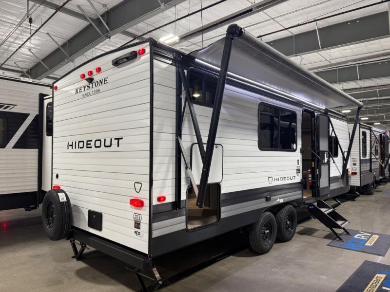 With any Hideout travel trailer by Keystone, you will find functional features and comfort at every turn! Each one is built with tinted safety glass windows and a walkable roof for added durability. There are also Solid Step entry steps outside, along with an outside shower, heavy-duty stabilizer jacks, a spare tire kit and Tire Linc TPMS prep. You'll love the pressed membrane premium countertops inside, plus a decorative tub surround, LED lighting, blackout night shades, and many more comforts. Additional features include a tankless water heater, a porcelain foot flush toilet, a power tongue jack, and an XL entry assist handle to name just a few!