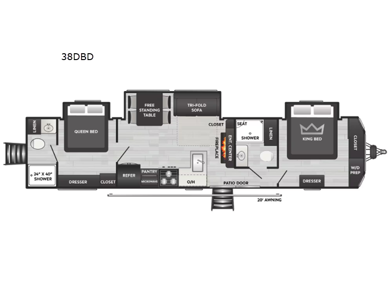 Sleeps 6 Length 42 ft 10 in Ext Height 11 ft 10 in Int Height 0 ft Interior Color Stonebriar Hitch Weight 1530 lbs Dry Weight 10499 lbs Cargo Capacity 1201 lbs Fresh Water Capacity 45 gals Grey Water Capacity 138 gals Black Water Capacity 78 gals Furnace BTU 30000 btu Available Beds King Refrigerator Type 12V Refrigerator Size 16 cu ft Cooktop Burners 3 Number of Awnings 1 LP Tank Capacity 30 Water Heater Type Tankless AC BTU 15000 btu Awning Info 20' Power w/LED Lights Axle Count 2 Number of LP Tanks 2 Shower Type Standard Electrical Service 50 amp Similar Travel Trailer Floorplans