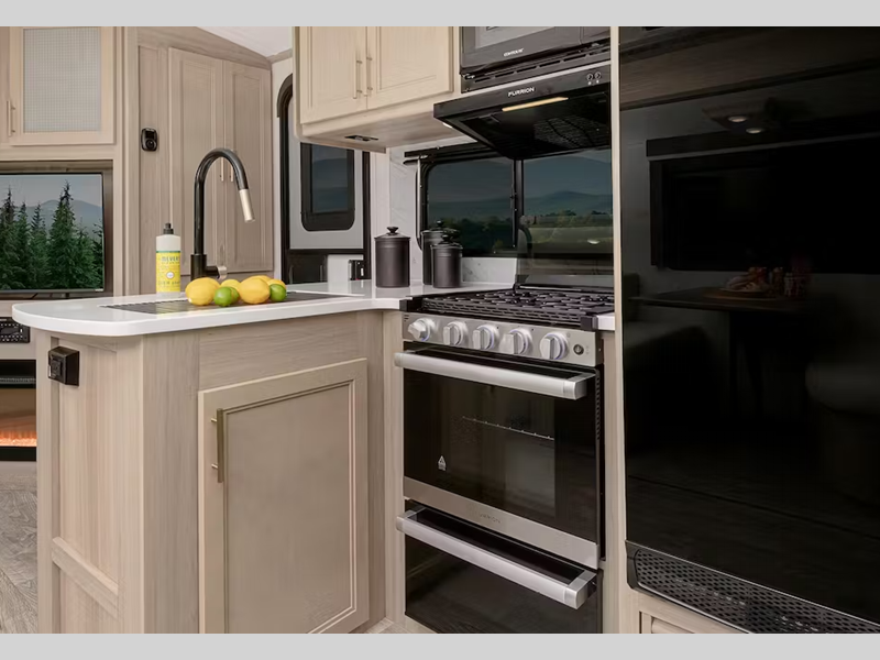 - 3-burner gas range and 21" Furrion® stove w/ low pro hood vent