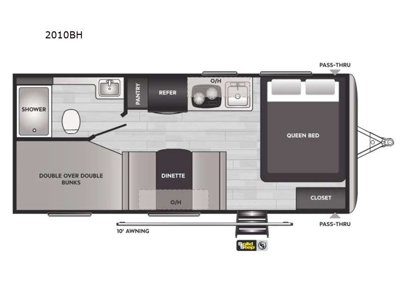 Sleeps 7 Length 22 ft 10 in Ext Width 8 ft Ext Height 10 ft 4 in Interior Color Maple Hitch Weight 465 lbs Dry Weight 3815 lbs Cargo Capacity 1640 lbs Fresh Water Capacity 21 gals Grey Water Capacity 30 gals Black Water Capacity 30 gals Tire Size ST205/75R14D Furnace BTU 20000 btu Number Of Bunks 2 Available Beds Queen Refrigerator Type 12V Refrigerator Size 3.3 cu ft Cooktop Burners 2 Number of Awnings 1 LP Tank Capacity 20 lbs Water Heater Type Tankless Awning Info 15' Power Axle Count 1 Number of LP Tanks 1 Shower Type Standard Electrical Service 30 amp Similar Travel Trailer Floorplans