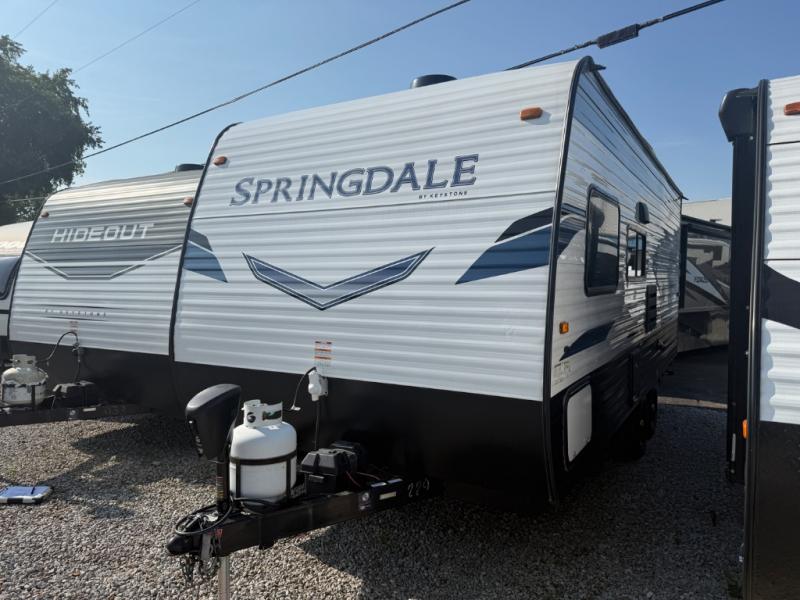 With any Springdale Mini travel trailer by Keystone, you will enjoy lightweight towing thanks to their single-axle! The AlphaPly TPO roof membrane is ultra durable, and the power awning will provide protection from the sun as you relax in your camp chairs outside. Each model includes blackout night shades, LED lighting, plus many more interior comforts. There is also a roof A/C and 20K BTU furnace to keep you comfortable, plus a tankless water heater for endless hot showers!