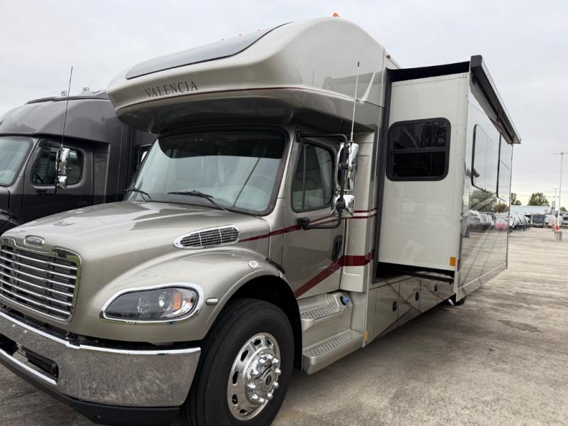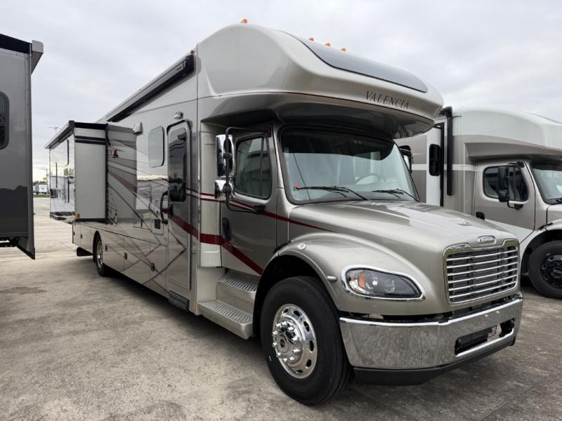 Each one of these Renegade Valencia Super C diesel motorhomes offer ultimate comfort and durable construction! They have a Freightliner S2RV chassis for a refined ride with responsive handling, as well as a powerful Cummins ISB 360 HP engine with a 3,000MH Alison transmission and a single 100 gallon fuel tank to get you farther. A few of the beautifully designed interior features are the solid hardwood cabinets, the polished solid surface countertops, and the stainless steel appliances. Travel in comfort and style with the modern furniture and abundant storage areas like the exterior steel storage compartments with carpeted lining. You will also appreciate the four point automatic hydraulic leveling system and the multiplex system with Bluetooth app control. With eight colorway paint options and three interior décor options, you can be sure to find the right one for you!