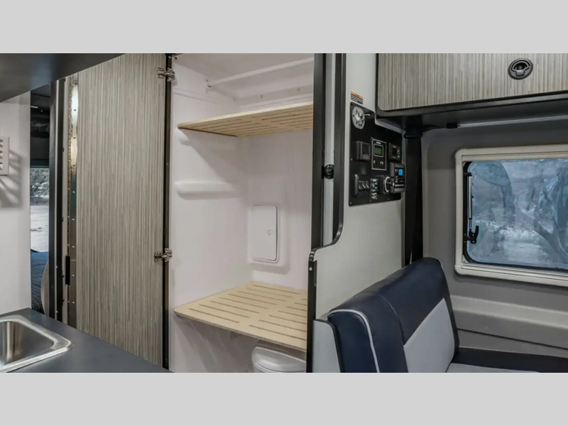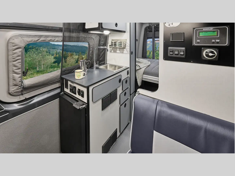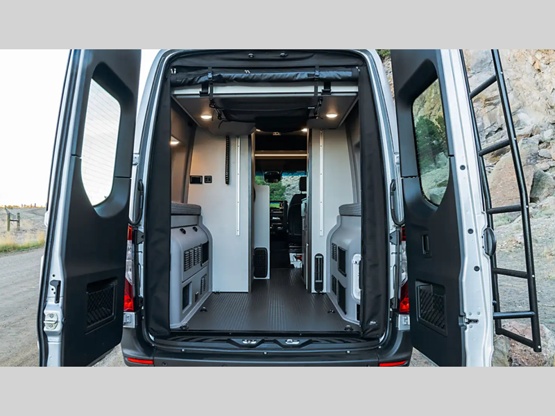 The interior of the Revel Sport is designed for comfort with lounge seating with a removable table, heavy duty vinyl flooring, and a versatile living space. Since this van features a power lift bed, you can utilize this space as a gear garage during the day. The exterior is just as accommodating with its luggage rack, movable ladder, side and rear screen doors, plus more!