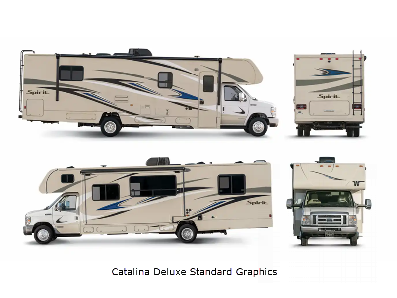 Sleeps 8 Slides 2 Length 32 ft 9 in Ext Width 8 ft 6 in Ext Height 11 ft Int Height 6 ft 10 in Interior Color Lennon w/Charcoal, Lennon w/Medium Gray, Starr Exterior Color Standard Graphics; Catalina Deluxe, Chestnut Deluxe, Full-Body Paint; Cool Mist, Suede Hitch Weight 7500 lbs GVWR 14500 lbs Fresh Water Capacity 44 gals Grey Water Capacity 34 gals Black Water Capacity 37 gals Furnace BTU 30000 btu Generator 4,000 Watt Gas Fuel Type Gasoline Engine Premium 7.3L V8 Chassis Ford E450 Horsepower 350 hp Fuel Capacity 55 gals Wheelbase 220 in Number Of Bunks 3 Available Beds Queen Refrigerator Type Two Way Large Double Door Refrigerator Size 8 cu ft Cooktop Burners 3 Shower Size 26" x 38" Number of Awnings 1 Axle Weight Front 5000 lbs Axle Weight Rear 9600 lbs LP Tank Capacity 76.14 lbs Water Heater Capacity 6 gal Water Heater Type LP with Electronic Ignition AC BTU 15000 btu Basement Storage 85 cu. ft. TV Info LR 32" HDTV, BR 24" HDTV Awning Info 10' 4" Power with LED Lighting Gross Combined Weight 22000 lbs Shower Type Standard Electrical Service 30 amp Similar Floorplans