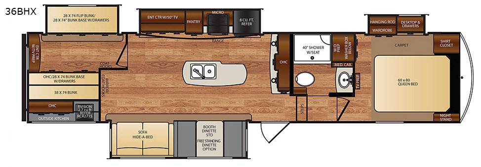 The interior design, especially the bathroom area with his and hers sinks; separate commode behind an actual solid wood door; a separate shower; and a washer/dryer combination as well. My wife and I really love the setup, which is rare.